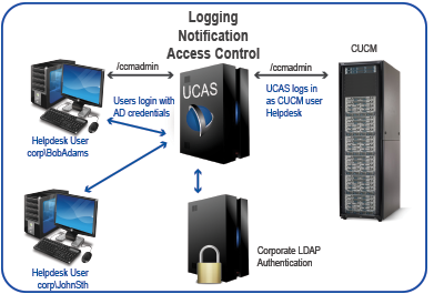 Users log into the UCAS interface using the corporate LDAP or Active Directory credentials and select a UC cluster and admin interface such as ccmadmin.